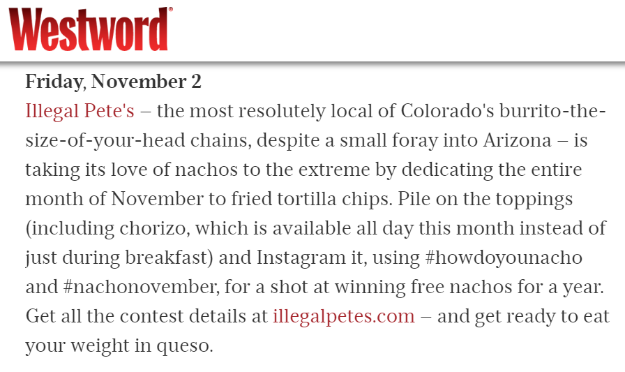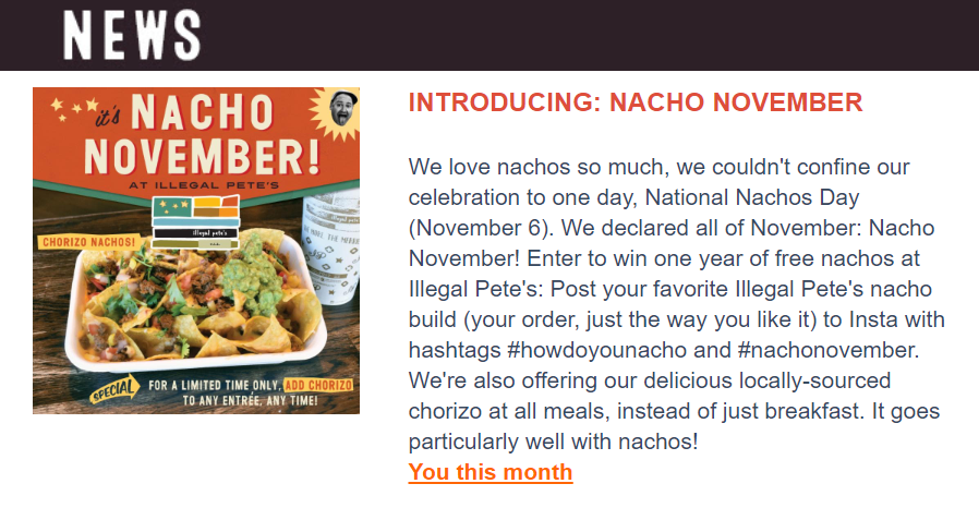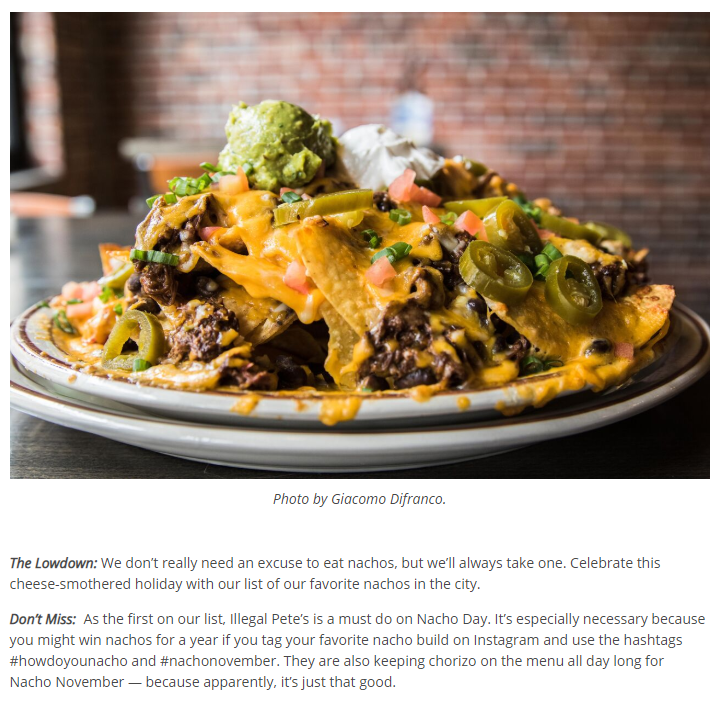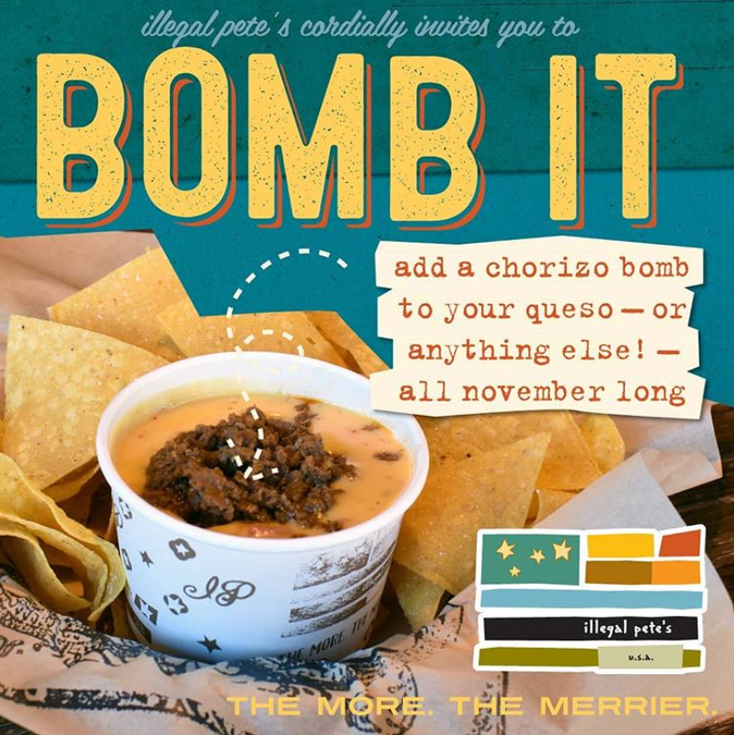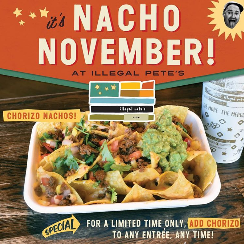 - In honor of everyone’s favorite snack-turned-meal, Illegal Pete’s is declaring all of November: Nacho November! Add our spicy pork chorizo, which is typically only available during breakfast/brunch, to any entree throughout the day. Tell us what your favorite nacho build is on Instagram for a chance to win free nachos for a year. Learn how to enter here: www.nachonovember.com