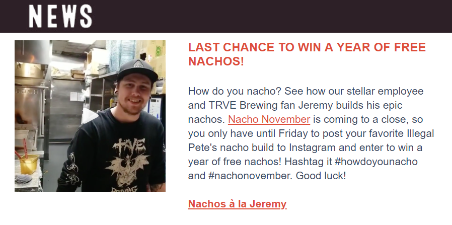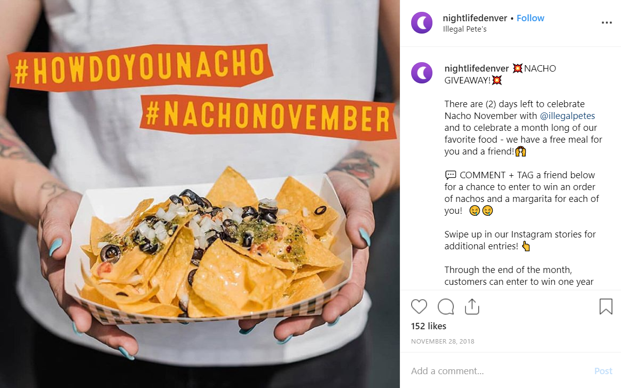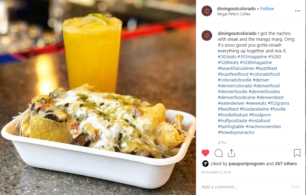 - A consumer contest encouraging guests to post their favorite Illegal Pete’s nacho build on Instagram for a chance to win free nachos for a year.