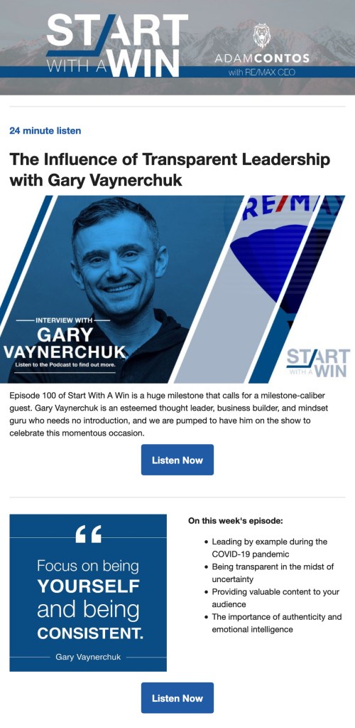 In preparation for the show’s 100th episode, Brand Viva worked alongside RE/MAX’s internal Senior Social Media Manager to book a landmark guest and create a promotional plan. I developed a two-week campaign strategy to help highlight the podcast’s 100th episode milestone. I was responsible for campaign messaging, as well as content, email, and social media strategies. The campaign launched in August 2020 after announcing the special guest: Business and digital marketing expert, Gary Vaynerchuk.