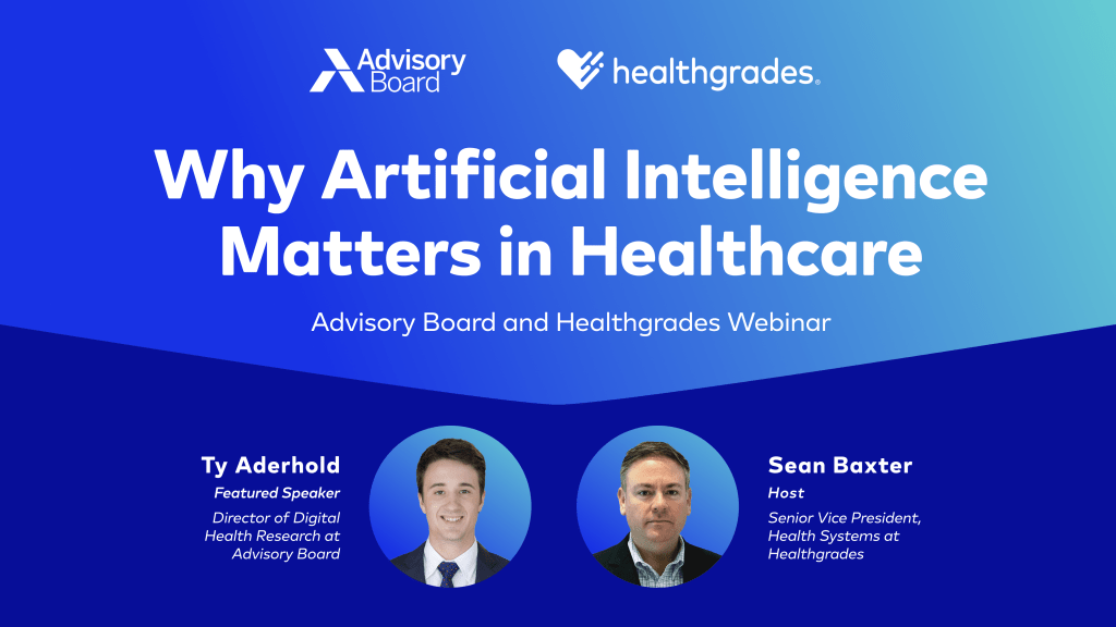 View the on-demand recording of Why Artificial Intelligence Matters in Healthcare, a webinar hosted by Healthgrades and Advisory Board. Ty Aderhold, Director of Digital Health Research at Advisory Board, guides attendees through an understanding of artificial intelligence (AI), why it is important now, the unique challenges AI presents in healthcare, and how organizations, leaders, and teams should respond to AI today.