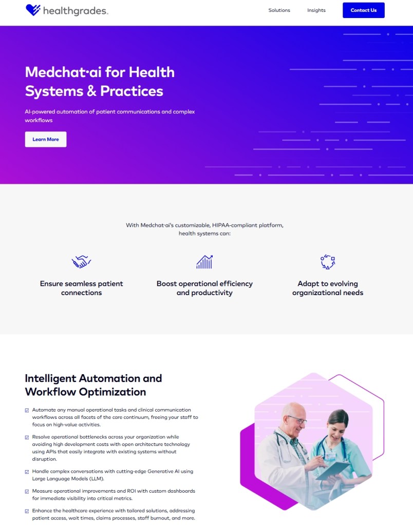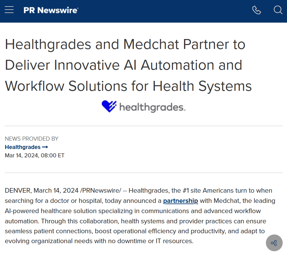Healthgrades, a leading platform for patients searching for doctors and hospitals, entered into a reseller partnership with Medchat·ai, an AI-powered healthcare platform focused on patient communication and workflow automation.